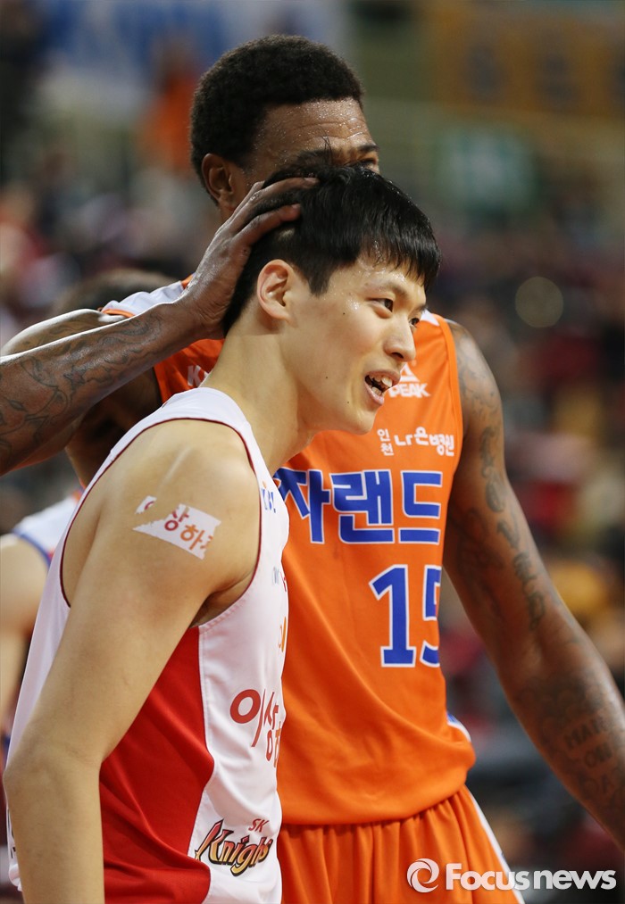 (인천=포커스뉴스) 29일 인천 삼산체육관에서 열린 2015-2016 프로농구 전자랜드-SK 경기에서 전자랜드 포웰이 SK 김선형의 머리를 쓰다듬고 있다.
