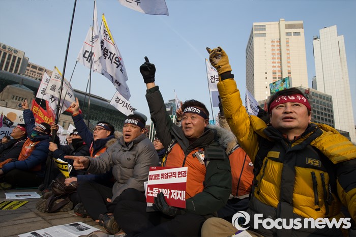(서울=포커스뉴스) '민주노총 전국노동자대회'가 열린 30일 오후 서울광장에서 민주노총 조합원들이 정부의 '일반 해고'와 '취업규칙 변경' 양대 지침 철회와 노동개악 중단을 촉구하고 있다.