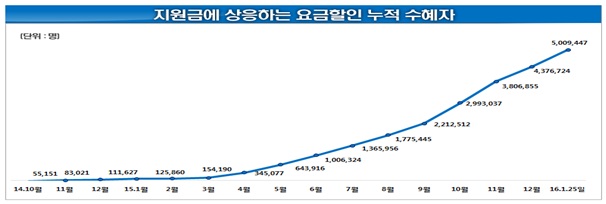 31일 미래창조과학부에 따르면 지난 25일까지 요금할인 누적 수혜자는 500만9447명이다. 지난해 4월 할인율을 12%에서 20%로 상향한 이후 가입자는 모두 483만3574명이다.