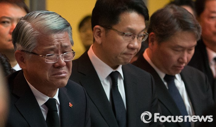 (서울=포커스뉴스) 31일 오전 서울 강남구 삼성서울병원에서 故 최종건 SK그룹 창업주의 아내 노순애 여사 발인식이 진행 되고 있다. 왼쪽부터 최신원 SKC 회장, 최창원 SK케미칼 부회장, 최태원 SK 회장.