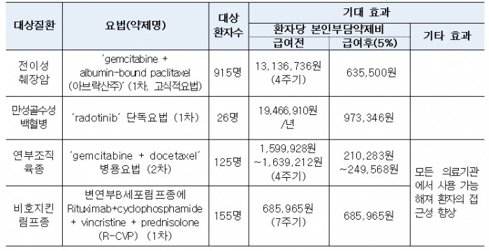 복지부 관계자는 “이번 건강보험 급여 확대는 췌장암과 같이 치료제가 부족하거나, 만성골수성백혈병이나 연부조직육종 등 환자수가 적어 지원 순위에서 밀릴 우려가 있는 암질환에 대해 건강보험 보장성을 확대하는 조치인만큼 의의가 더욱 크다”고 말했다.