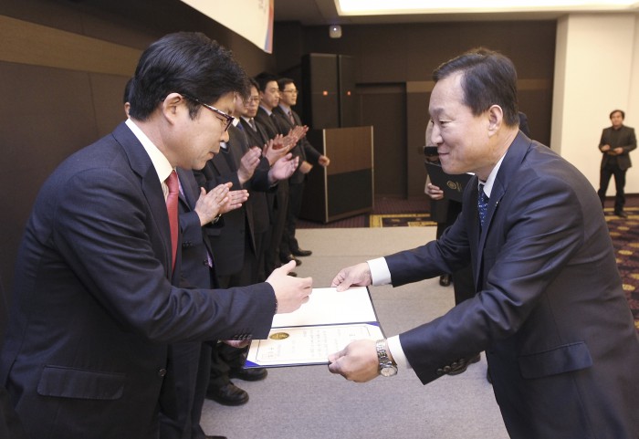 김용덕 KT&G 광주공장장은 "에너지 절약과 효율 향상으로 기업 경쟁력 강화뿐 아니라 친환경 경영을 실천하는 일석이조의 효과를 거뒀다"며 "향후에도 환경친화적 공장 운영으로 기업시민으로서의 사회적 책임을 다 할 것"이라고 밝혔다.서울 양재동 더케이호텔서울에서 열린 한국에너지공단 주최 '2015 에너지 진단 개선이행 우수 사업장 표창 수여식'에서 김용덕 KT&G 광주공장장(사진 왼쪽)이 한영로 에너지공단 사업진흥이사(사진 오른쪽)로부터 산자부 장관 표창을 받고 있다.<사진제공=KT&G>