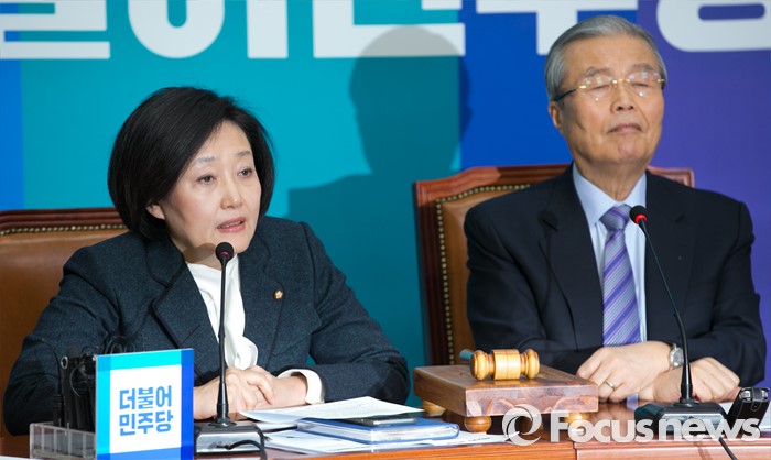 (서울=포커스뉴스) 박영선 더불어민주당 비대위원이 1일 오전 서울 여의도 국회에서 열린 비상대책위원회의에 참석해 발언을 하고 있다. 오른쪽은 김종인 비대위원장.