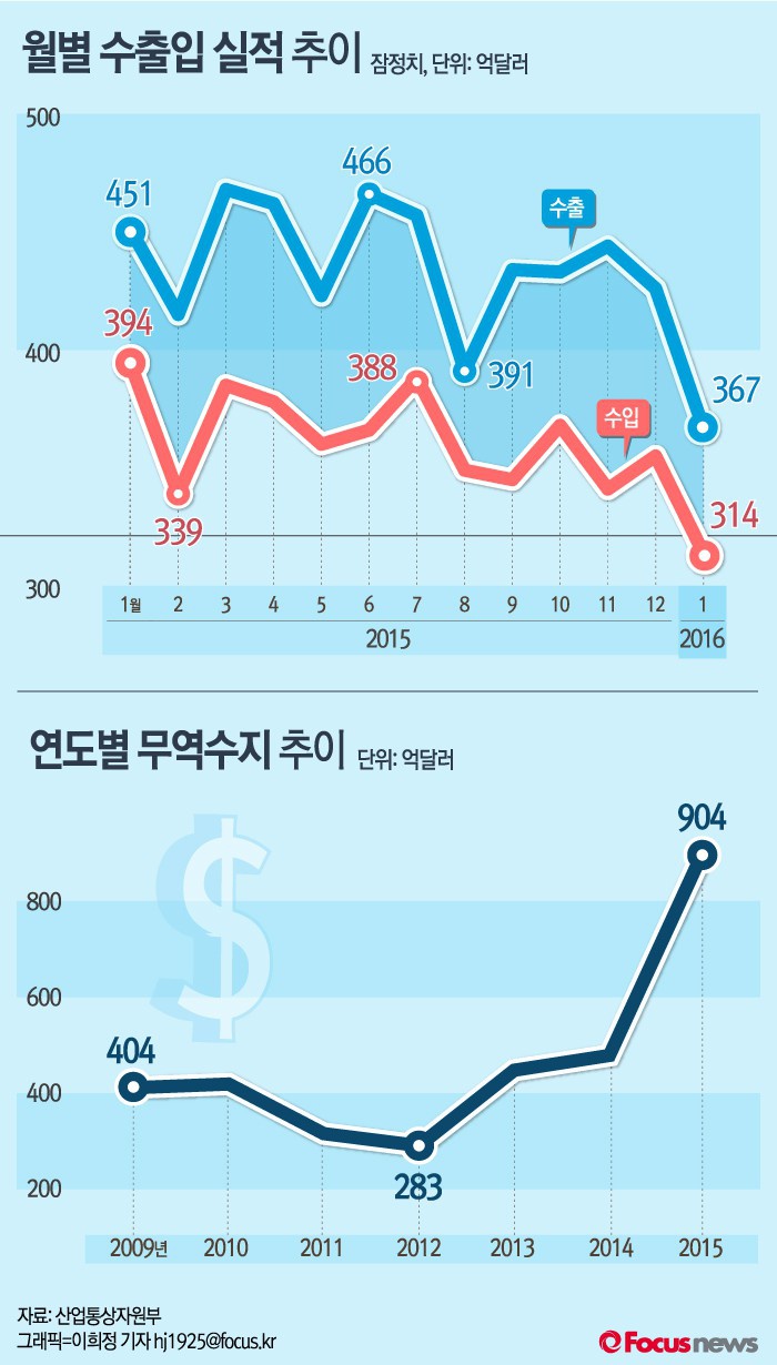 (서울=포커스뉴스) 산업통상자원부가 31일 밝힌 자료에 따르면 올 1월 수출액이 367억달러를 기록해 전년 동기대비 18.5% 줄어들었다. 수입액은 지난해 보다 줄어든 314억달러를 기록했고 2015년 무역수지는 904억 달러이다.