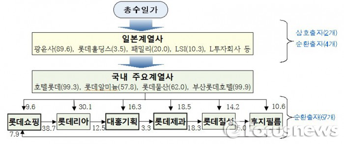 이렇듯 신격호 총괄회장 등 롯데 총수일가는 일본과 한국에서 모두 순환출자 등 복잡한 계열사 간 출자를 통해 지배력을 유지해 왔다.