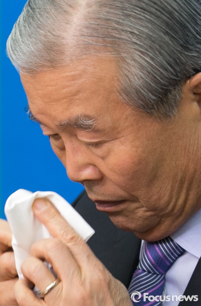 (서울=포커스뉴스) 1일 오전 서울 여의도 국회에서 열린 더불어민주당 유능한경제정당위원회, 더불어 잘사는 경제를 위한 '더불어 성장론' 정책발표 기자회견에 참석한 김종인 위원장이 얼굴을 닦고 있다.