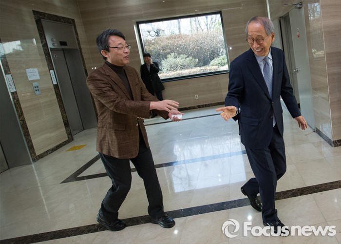 (서울=포커스뉴스) 국민의당 윤여준 공동창당준비위원장이 김성식 전 의원의 배웅을 받으며 1일 오전 서울 마포구 국민의당 당사를 빠져나오고 있다. 윤 위원장은 국민의당의 창당 준비작업이 거의 마무리 된 것으로 보인다며 건강상의 이유로 당분간 요양을 할 계획이라고 밝혔다.