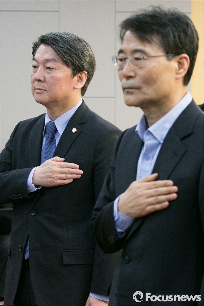 (서울=포커스뉴스) 안철수(왼쪽) 국민의당 인재영입위원장과 장하성 고려대 교수가 1일 오전 서울 여의도 국회 의원회관에서 열린 경제토크에 참석해 국민의례를 하고 있다.