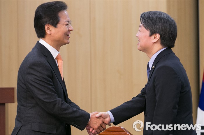 (서울=포커스뉴스) 안철수(오른쪽) 국민의당 인재영입위원장과 천정배 의원이 1일 오전 서울 여의도 국회 의원회관에서 열린 경제토크에 참석해 악수하고 있다.
