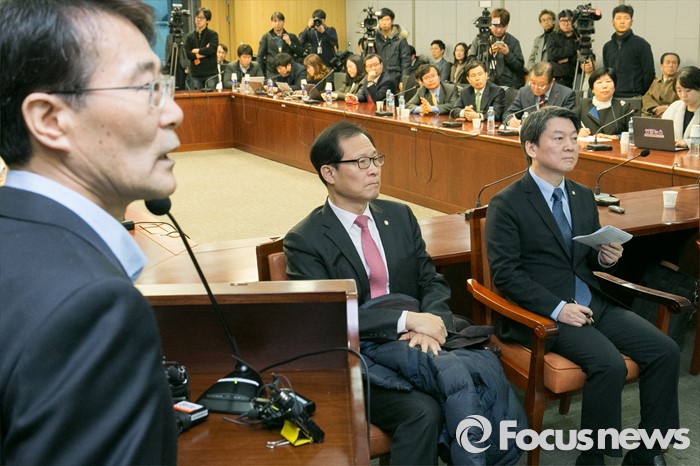 (서울=포커스뉴스) 장하성(왼쪽) 고려대 교수가 1일 오전 서울 여의도 국회 의원회관에서 열린 '안철수·장하성 경제토크'에 참석해 발제를 하는 동안, 안철수(오른쪽) 국민의당 인재영입위원장이 경청하고 있다.