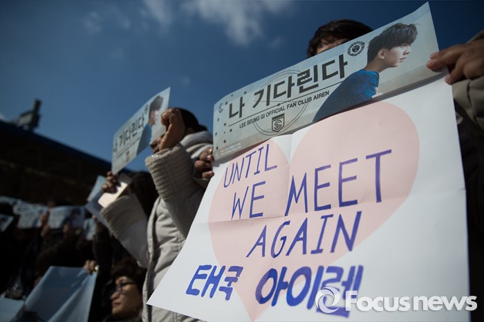 (논산=포커스뉴스) 1일 오후 충남 논산 육군훈련소 앞에서 가수 겸 배우 이승기의 팬들이 응원 문구가 적힌 현수막을 들고 입소를 기다리고 있다.