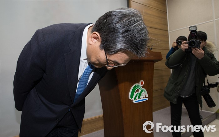 (청주=포커스뉴스) 노영민 더불어민주당 의원이 1일 오후 충북 청주 충북도청 기자실에서 4.13 총선 불출마 선언 기자회견을 마치고 기자회견장을 마치고 인사하고 있다.
