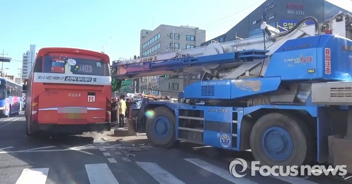 (서울=포커스뉴스) 1일 오후 1시 25분쯤 서울 성동구 중곡동 KEB하나은행 앞 사거리에서 25톤 크레인이 광역버스 9403번과 추돌하는 사고가 발생했다.
