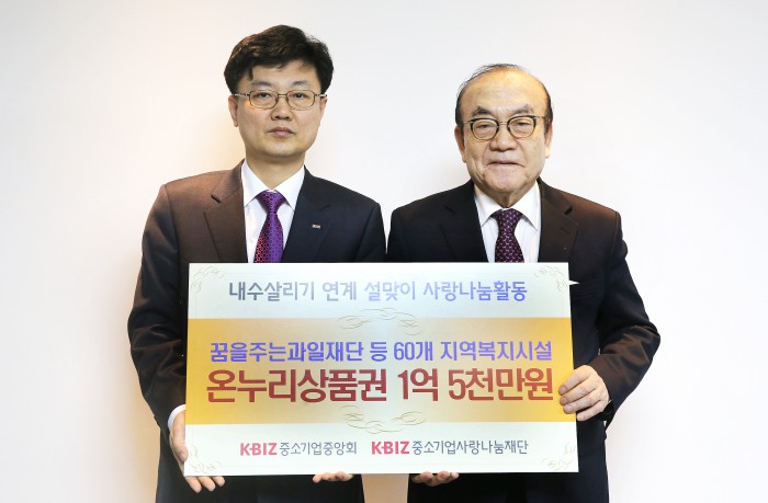 (서울=포커스뉴스) 중소기업사랑나눔재단(이사장·박성택, 이하 중기사랑나눔재단)은 설 명절을 맞아 1일 서울 여의도 중소기업중앙회에서 1억5000만원 상당의 온누리상품권을 '꿈을주는과일재단' 등 전국 60여개 복지시설에 전달했다.
