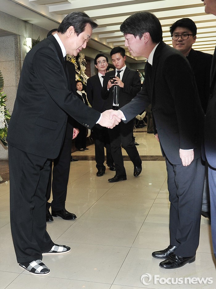 | △ 김 전 대통령 빈소에서 인사를 나누는 김무성-안철수 |