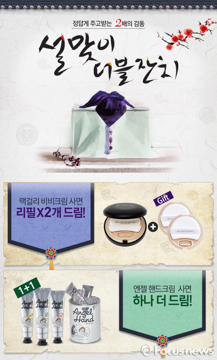 (서울=포커스뉴스) 디자인 화장품 브랜드 투쿨포스쿨은 설을 맞아 하나를 사면 하나를 추가 제공하는 ‘더블 잔치’를 진행한다.