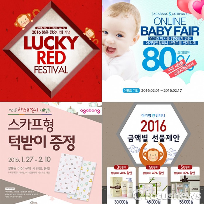 럭키 레드 기획전은 빨강 색상 제품을 최대 68% 할인 판매하며, ‘럭키 16’으로 선정된 상품을 구입하면 16% 할인쿠폰을 증정한다. 베이비페어에서는 아가방앤컴퍼니 상품을 최대 80% 할인하고 3만원 이상 구매고객에게 기념품을 제공한다.브랜드 별 할인행사 기획전 포스터. <사진제공=아가방앤컴퍼니>