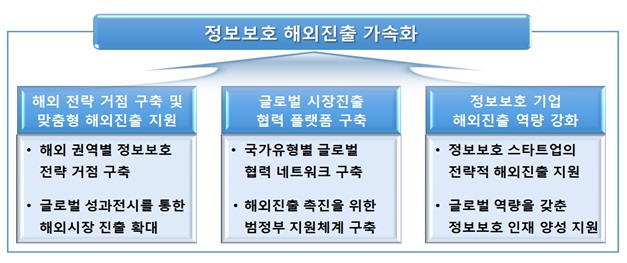 정보보호기업의 해외진출 촉진을 위해 국방부·국정원·외교부·산업부·행자부 등 범정부 지원체계가 구축된다. 정부부처의 전문성을 활용해 재외공관 무관을 대상으로 초청 홍보를 추진하고, ICT 퇴직전문가의 인적네트워크를 통한 정보수집·제공 등 범정부 역량을 활용할 계획이다.