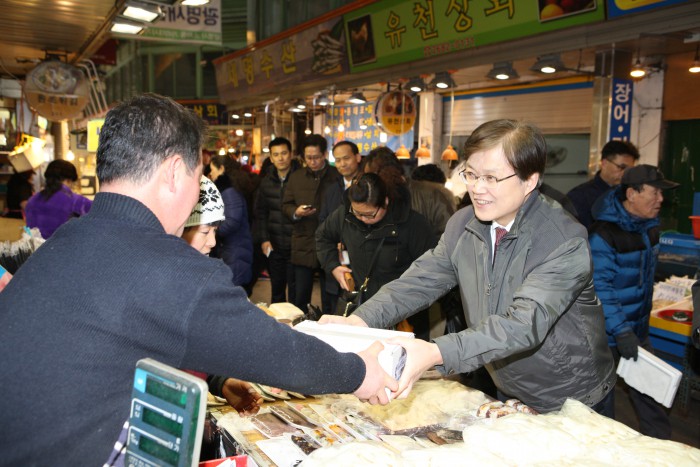 (서울=포커스뉴스) 최양희 미래창조과학부 장관은 3일 오후 경기도 광명시에 위치한 광명전통시장을 방문해 설 명절을 앞둔 전통시장의 경기를 점검하고, 상인들로부터 재래시장 발전 방안 등에 대해서 의견을 청취했다.