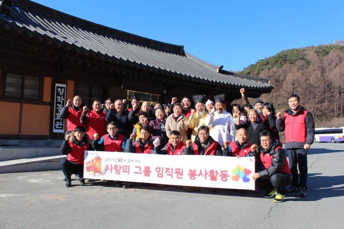 KT 임직원 사랑의 봉사단은 오전에는 청학동 및 학동 집집마다 방문해 설 맞이 떡을 나눴다. 오후에는 독거노인 5명의 가정을 찾아 땔감을 준비하는 등 따뜻한 겨울나기를 위해 힘을 모았다. 거동이 불편한 독거노인의 가정에서는 집안 구석구석 묵은 때를 제거하는 청소를 시행했다.