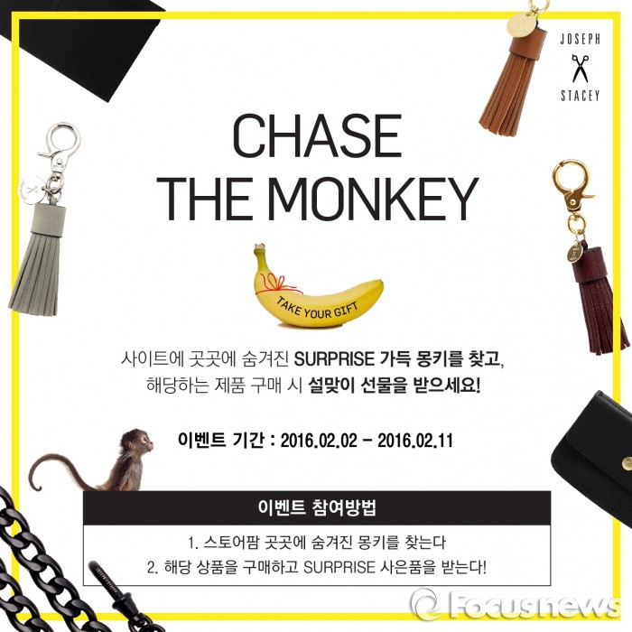 조셉앤스테이시 담당자는 “특별한 2월에는 작지만 의미 있는 선물로 감사의 마음을 전하고, 브랜드에서 준비한 소소한 이벤트들을 통해 소중한 사람들과 함께 참여하고 즐길 수 있는 의미 있는 시간을 갖길 바란다.”고 전했다.'원숭이를 찾아라' 온라인 이벤트 포스터. <사진제공=조셉앤스테이시>