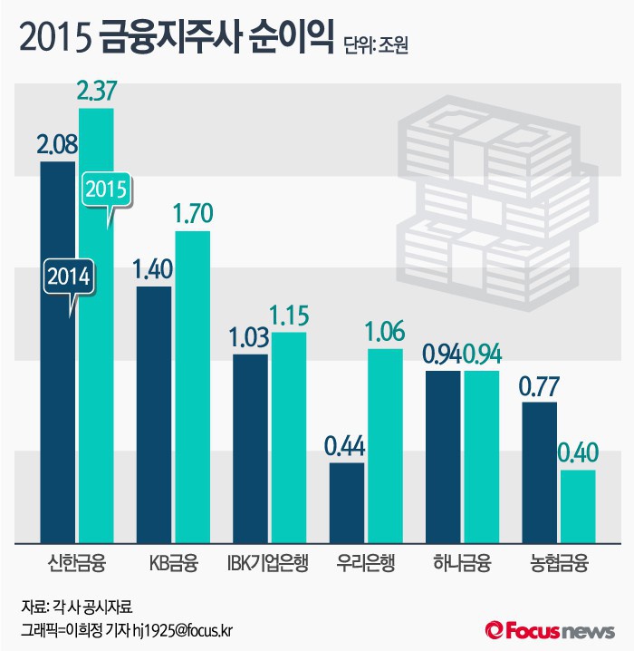 (서울=포커스뉴스) 저금리 기조에도 지난해 금융지주 및 은행들의 순익은 오히려 상승한 것으로 집계됐다. 순이자마진은 소폭 하락했지만 수수료 수익 등 비이자이익이 순익 호조를 이끌었다.