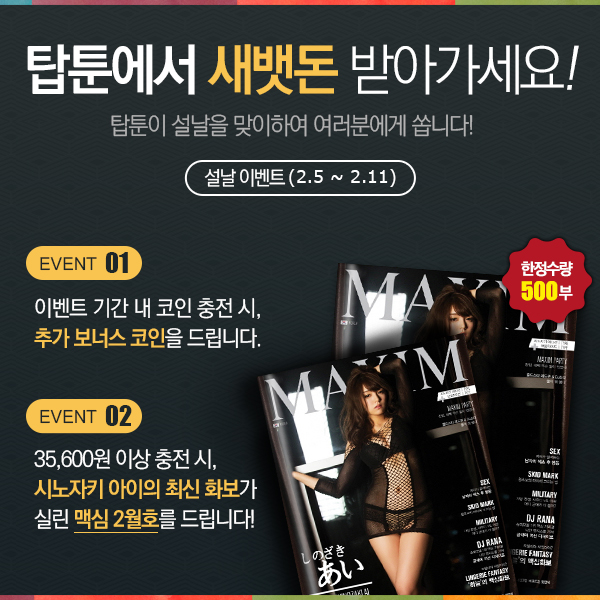 또 설 연휴 기간 동안 코인을 결제할 경우 기존 코인 혜택에 추가적인 코인이 지급된다. 60코인 이상 결제한 회원은 기존에 포함되었던 추가 코인과 더불어 세뱃돈 개념의 또 다른 코인 혜택을 받을 수 있다. 이는 최소 10코인에서 최대 250코인까지이며 결제 금액이 높을수록 추가코인 혜택도 높아진다.탑툰 설날 이벤트 포스터.<사진제공=탑툰>