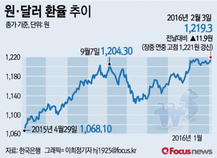재닛 옐렌 의장은 10~11일(현지시간) 의회 반기통화정책 청문회에 출석해 통화정책과관련한 연설과 답변을 한다. ▲금리 인상 속도 ▲미국 경제 및 인플레이션 전망 변화 ▲대외 불안요인에 대한 언급 여부 등이 국제 금융시장에 영향을 줄 것으로 보인다.(서울=포커스뉴스) 3일 서울 외환시장에서 원·달러 환율은 한때 1220원을 돌파, 장중 연중 고점인 1221.0원까지 상승하며 약세를 보이다 전 거래일보다 11.9원 상승한 1219.3원에 마감했다. 2016.02.03 이희정 기자