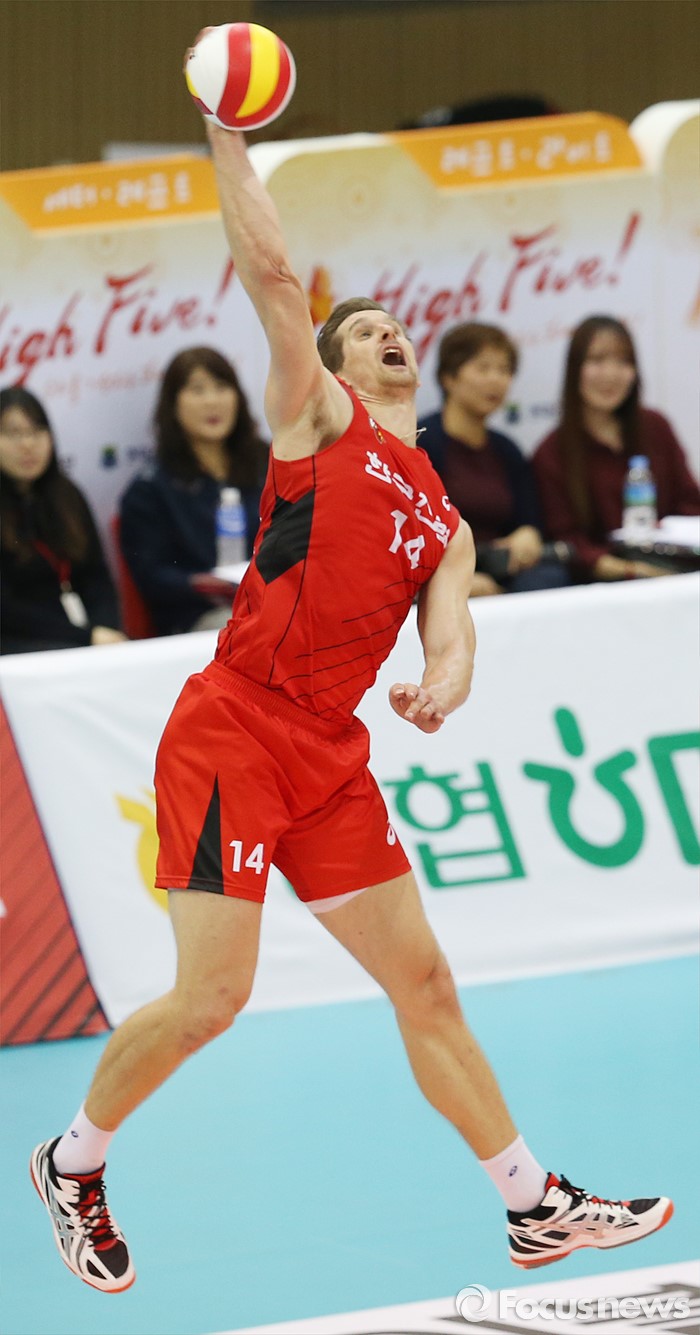 한국전력 외국인선수 얀 스토크가 36득점으로 활약한 가운데 전광인(19득점)과 서재덕(14득점)이 득점지원했다. 우리카드는 외국인선수 알렉산더가 28득점으로 분전했지만 박진우, 박상하, 최홍석(이상 9득점) 등 국내선수들의 득점 지원이 부족했다.(수원=포커스뉴스) 5일 수원실내체육관에서 열린 프로배구 '2015~2016 NH농협 V-리그’남자부 2라운드 한국전력-대한항공 경기에서 한국전력 얀 스토크가 스파이크 서브를 넣고 있다. 2015.11.05 우정식 기자2015.12.14 허진우 기자