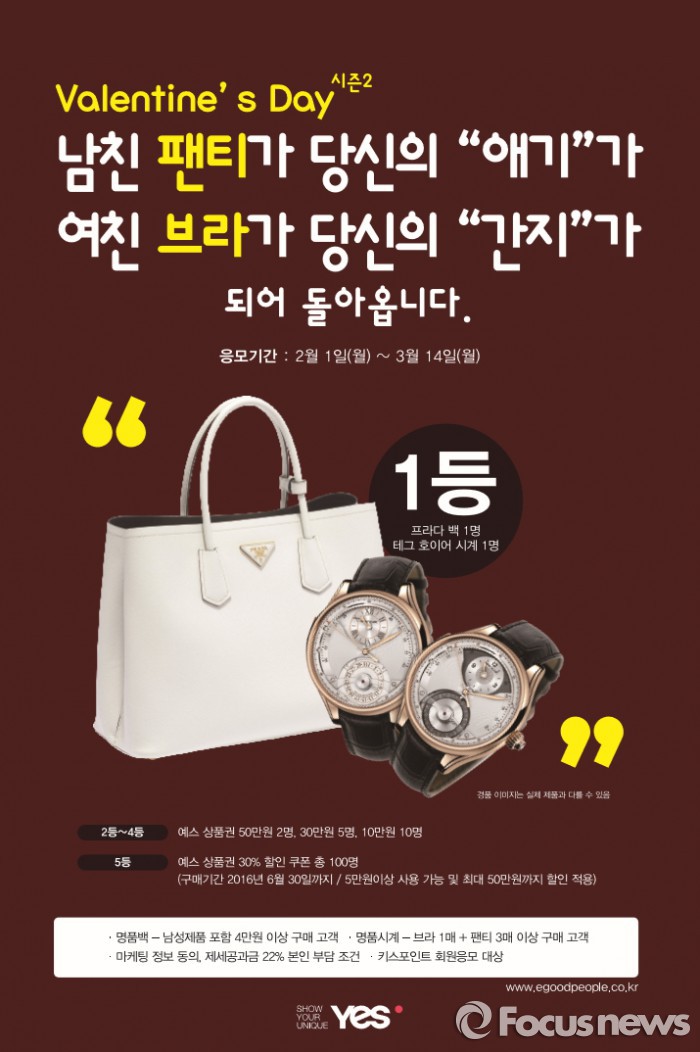 (서울=포커스뉴스) 속옷기업 좋은사람들의 브랜드 예스는 밸런타인데이를 맞아 오는 3월14일까지 ‘밸런타인데이 명품 이벤트 시즌2’를 실시한다.