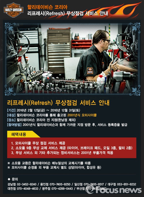 (서울=포커스뉴스) 할리데이비슨 코리아는 올해 말까지 '2001 리프레시 서비스'를 통해 2001년식 모터사이클을 무상으로 점검한다.