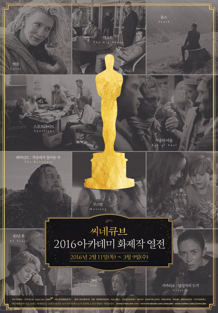 영화 '빅쇼트' '레버넌트:죽음에서 돌아온 자' '캐롤' '유스' 등 국내 개봉작들도 기획전에서 함께 선보인다. 아카데미 시상식 전 후보들을 작품을 통해 직접 비교할 수 있는 셈이다.예술영화관 씨네큐브가 11일부터 다음달 9일까지 '2016 아카데미 화제작 열전'을 연다. 사진은 '2016 아카데미 화제작 열전' 포스터. <사진제공=씨네큐브>
