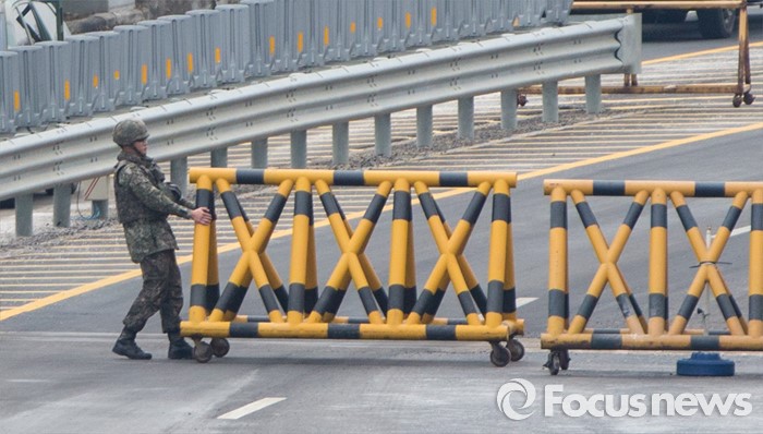 북한은 또한 "오전 10시부로 개성공업지구를 폐쇄하고 군사통제구역으로 선포한다"면서 "추방되는 인원들은 사품 외에 다른 물건들은 일체 가지고 나갈 수 없다"고 선언했다.11일 오후 경기 파주시 경의선 남북출입사무소에서 1사단 장병이 바리케이드를 옮기고 있다. 2016.02.11 양지웅 기자