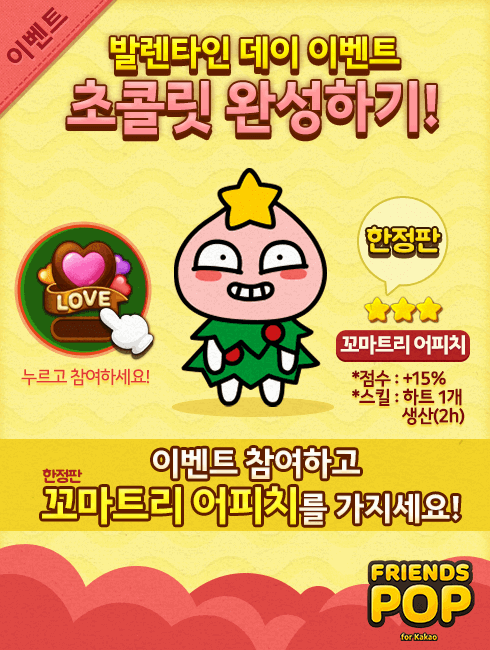 (서울=포커스뉴스) NHN픽셀큐브(대표 김상복)는 인기 퍼즐게임 '프렌즈팝 for Kakao'(이하 프렌즈팝)에서 밸런타인데이 이벤트를 진행한다고 12일 밝혔다.