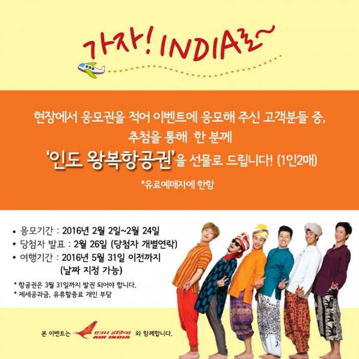 이와 더불어 연극 '인디아 블로그'를 함께 즐기고 진심으로 공감해준 관객들을 위해 준비한 '가자! INDIA로' 이벤트가 현재 진행 중에 있다. 현장에서 응모권을 통해 참여할 수 있으며 응모는 오는 24일까지 가능하다. 당첨자 발표는 오는 26일이며 당첨자에게는 2016년 5월31일까지 사용할 수 있는 인도 왕복항공권을 선물로 증정한다.