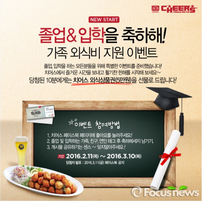 (서울=포커스뉴스) JH그룹의 생맥주 전문점 치어스는 졸업·입학 시즌을 맞아 ‘가족 외식비 지원’ 이벤트를 다음달 10일까지 실시한다.