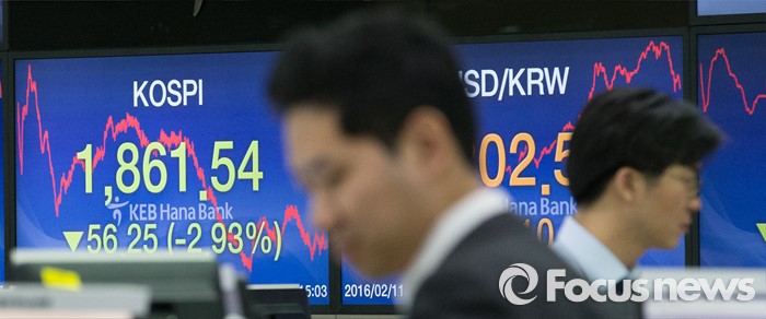 만약 H지수가 7500 선 밑으로 내려갈 경우 이를 기초 자산으로 한 주요 증권사들의 주가연계증권(ELS)의 원금손실 금액은 약 4조원에 이를 것으로 알려졌다.(서울=포커스뉴스) 코스피가 북한 리스크와 해외 증시 급락 등 국내외 악재로 인해 전 거래일보다 56.25(2.93%) 포인트 하락한 1861.54로 마감한 11일 오후 서울 중구 명동 KEB 하나은행 딜링룸에서 딜러들이 업무를 보고 있다. 이날 코스닥은 전 거래일보다 33.62(4.93%) 포인트 하락한 647.69로 마감했으며 원달러 환율은 5.1원 오른 1202.5원으로 거래를 마쳤다. 2016.02.11 오장환 기자