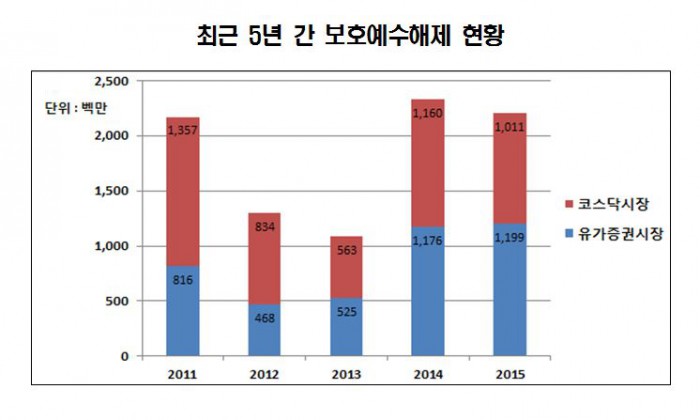 지난해 보호예수가 해제된 회사는 282개사로 지난 2014년(208개사) 보다 35.6% 증가했다.