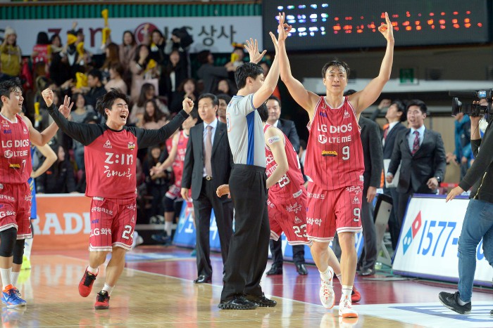 LG는 외국인선수 트로이 길렌워터의 득점력이 폭발하며 3쿼터까지 77-72로 앞섰다. 4쿼터 삼성의 매서운 반격에 역전을 허용했고, 이렇다 할 반전 기회를 잡지 못했다. 하지만 경기 막판 터진 연이은 3점포에 재역전승을 거두며 환호했다.