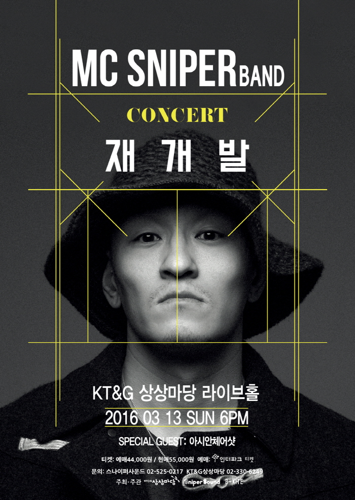 스나이퍼사운드는 15일 “MC 스나이퍼가 오는 3월13일 오후 6시 서울 서교동 KT&G 상상마당 라이브홀에서 콘서트 ‘재개발(再開發/redevelopment)’을 개최한다”고 밝혔다.