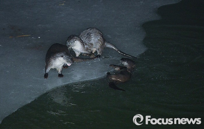 시화호 지킴이 최종인씨가 지속적으로 모니터링 하고 있는 수달 서식지에서 프리랜서사진가 이관희씨가 15일 새벽 얼음판 위로 거슬러 올라온 수달 4마리가 협공하여 잉어를 사냥하는 모습을 포착하는데 성공했다.