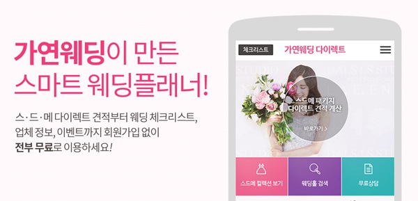 '가연웨딩 다이렉트'는 범람하는 웨딩 정보의 홍수 속에서 예비 신혼부부들이 복잡한 결혼 준비를 보다 합리적으로 진행할 수 있도록 도와주는 앱이다. 안드로이드와 iOS에서 모두 사용할 수 있다.