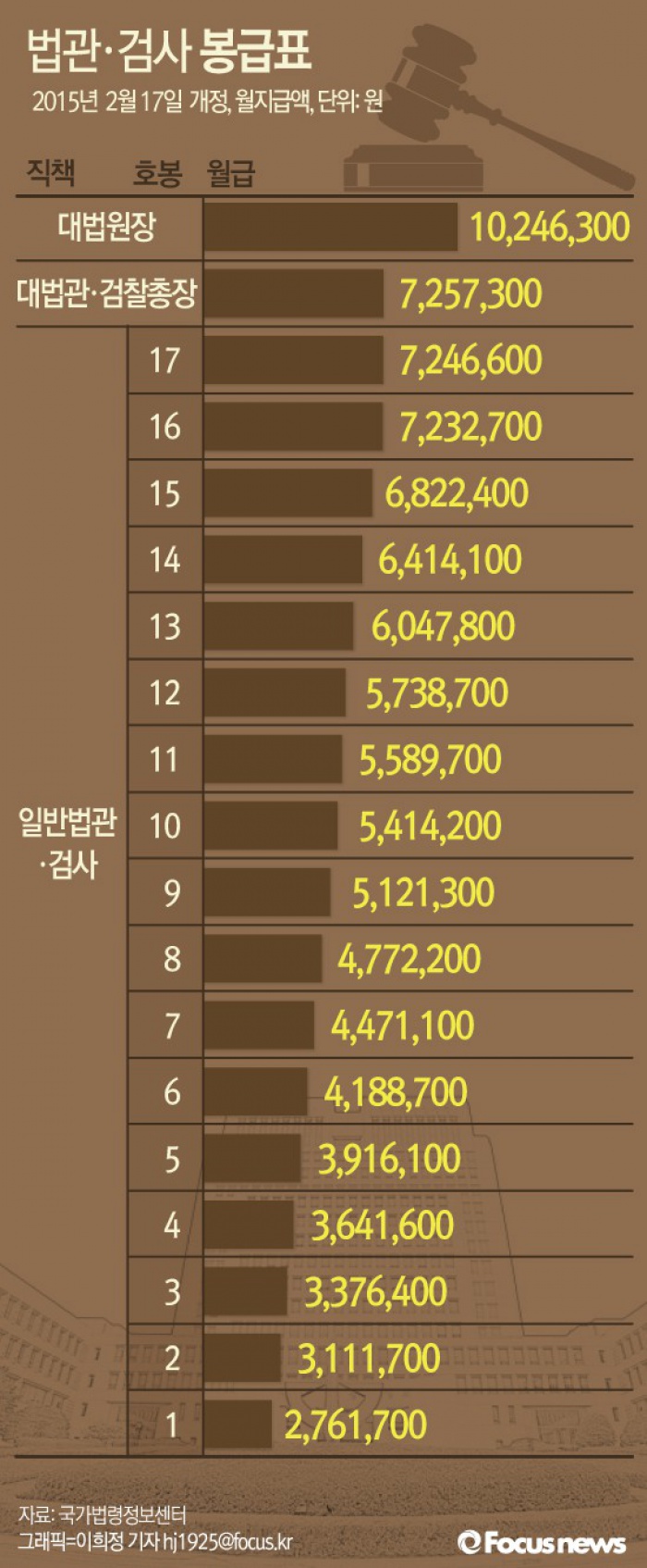 (서울=포커스뉴스) 오는 3월 대법원과 법무부가 기획재정부와 협의해 판검사 봉급 인상폭을 결정할 방침인 가운데 현행 법관 봉급제도에 대한 관심이 높아지고 있다.