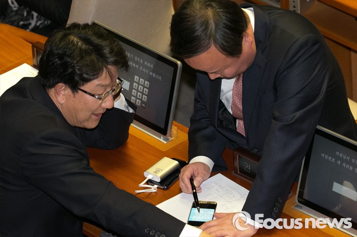 그러면서 "공관위원들은 공천룰 속에서만 활동할 수 있으며 공천룰을 벗어나는 결정을 할 수 없다"고 선을 그었다.(서울=포커스뉴스) 새누리당 권성동(왼쪽), 김재원 의원이 9일 오후 서울 여의도 국회 본회의장에서 선거구 지도를 보며 대화하고 있다. 2015.12.09 박철중 기자