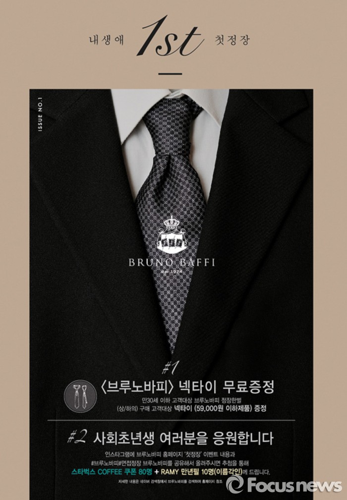 또 ‘생애 첫 정장’ 이벤트 이미지를 인스타그램에 공유하고 #브루노바피, #생애첫정장 등 이벤트 관련 해시태그를 남기면 추첨을 통해 총 90명에게 경품을 증정한다.