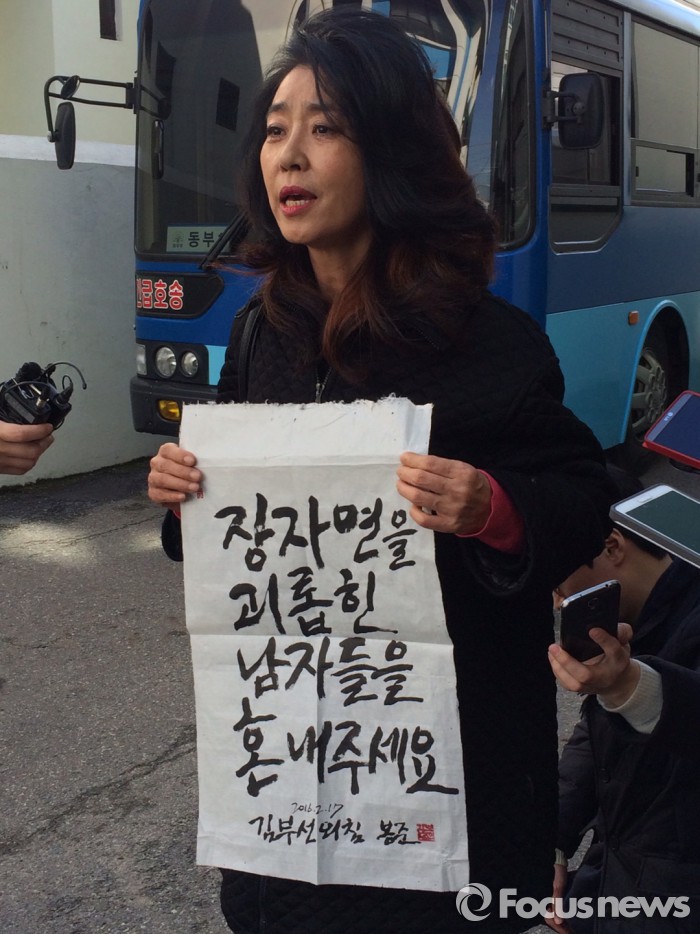 앞서 김부선씨는 지난해 5월 1심 재판에서 벌금 500만원을 선고받았지만 이에 불복해 항소했다.17일 서울동부지법 형사합의3부(부장판사 최종두)는 김부선씨의 항소를 기각하고 1심의 판단을 인정해 벌금 500만원을 선고했다. 김부선씨는 재판이 끝난 후 기자들을 만나 '장자연씨를 괴롭힌 남자들을 혼내달라'고 씌여진 종이를 들고 억울함을 호소했다. 2016.02.17 박요돈기자 smarf0417@focus.co.kr