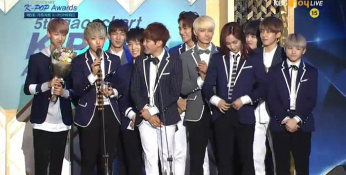 싸이, 슈퍼주니어, 빅뱅, 소녀시대 태연, 블락비 지코, 엑소(EXO), 방탄소년단, 아이콘, 빅스(VIXX), 위너 송민호, 미쓰에이, AOA, 레드벨벳, 백아연, 여자친구, 세븐틴 등이 참석했다.보이그룹 세븐틴이 ‘2016 가온차트 K-POP 어워드'에서 월드루키상을 받았다. <사진출처=KBS JOY 시상식 방송 캡처>