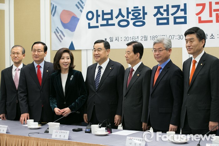 이날 회의에는 정부 측에서 한민구 국방부 장관과 임성남 외교부 제1차관, 김진섭 국정원 1차장 등이, 당에서는 김정훈 정책위의장, 나경원 외통위원장, 김성찬 국방정조위원장, 심윤조 외통정조위원장, 이철우 정보정조위원장 등이 참석했다.18일 오전 서울 여의도 국회에서 안보상황 점검 긴급 당정협의회 참석자들이 기념사진을 찍고 있다. 사진 왼쪽부터 임성남 외교부 1차관, 김성찬 국방위 여당 간사, 나경원 외통위원장, 김정훈 새누리당 정책위의장, 한민구 국방부 장관, 이철우 정보위 여당 간사, 심윤조 외통위 여당 간사. 2016.02.18 박철중 기자