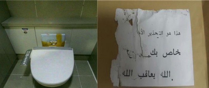 검찰 관계자는 “인천공항뿐만 아니라 인천항, 버스터미널 등 다중밀집장소에 대한 테러위험성이 상존해 체계적인 테러대응시스템 구축이 필요하다”며 “국정원, 검찰, 출입국사무소 등 유관기관과 유기적 테러 대응체계를 구축하고 단계별 테러 대응매뉴얼을 수립해 시행할 방침”이라고 말했다.인천공항 화장실에 설치된 폭발물(사진 왼쪽)과 아랍어 메시지. <사진제공=인천지검>