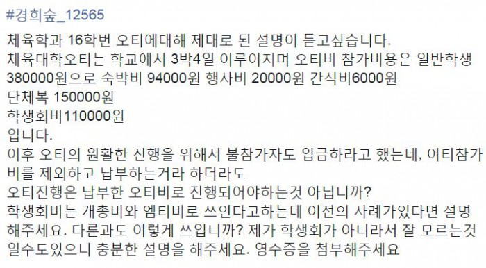경희대학교 체육대학의 신입생 OT 참가비가 터무니없이 높게 책정됐다는 의혹이 제기된 가운데 이를 계기로 그동안 덮여있던 문제들이 바로잡혀야 한다는 학생들의 목소리가 나왔다.